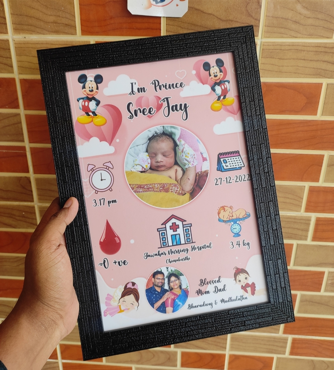 Capture your little one’s milestones in this personalised 13 × 9 inch baby details frame.
