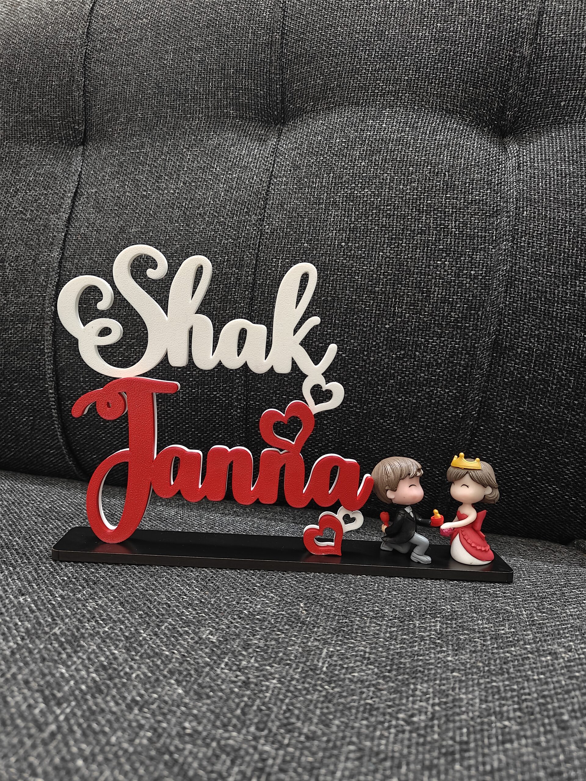 A charming 3D printed couple name stand featuring elegant dual-color design and a cute personalised doll. Perfect for anniversaries, weddings, birthdays, or proposals, this unique keepsake adds a romantic touch to any space and makes a memorable customised gift.