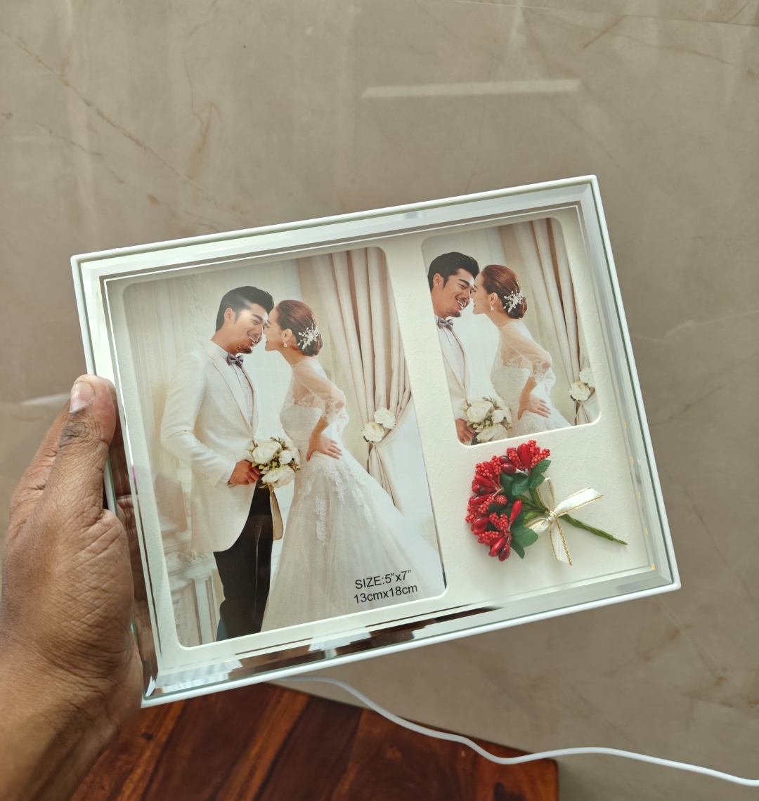 A stylish LED photo frame customised with two photos, designed to glow beautifully using a USB connection. Perfect for bedside tables, desks, or wall décor, it makes a thoughtful personalised gift for birthdays, anniversaries, and special occasions.