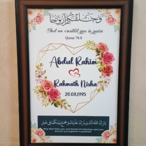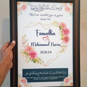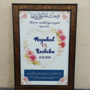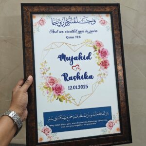 Celebrate the beauty of your Nikah with this elegant Muslim Wedding Frame, thoughtfully designed with the couple’s names and wedding date. Featuring a graceful Islamic-inspired design, this frame turns your special day into a timeless keepsake.