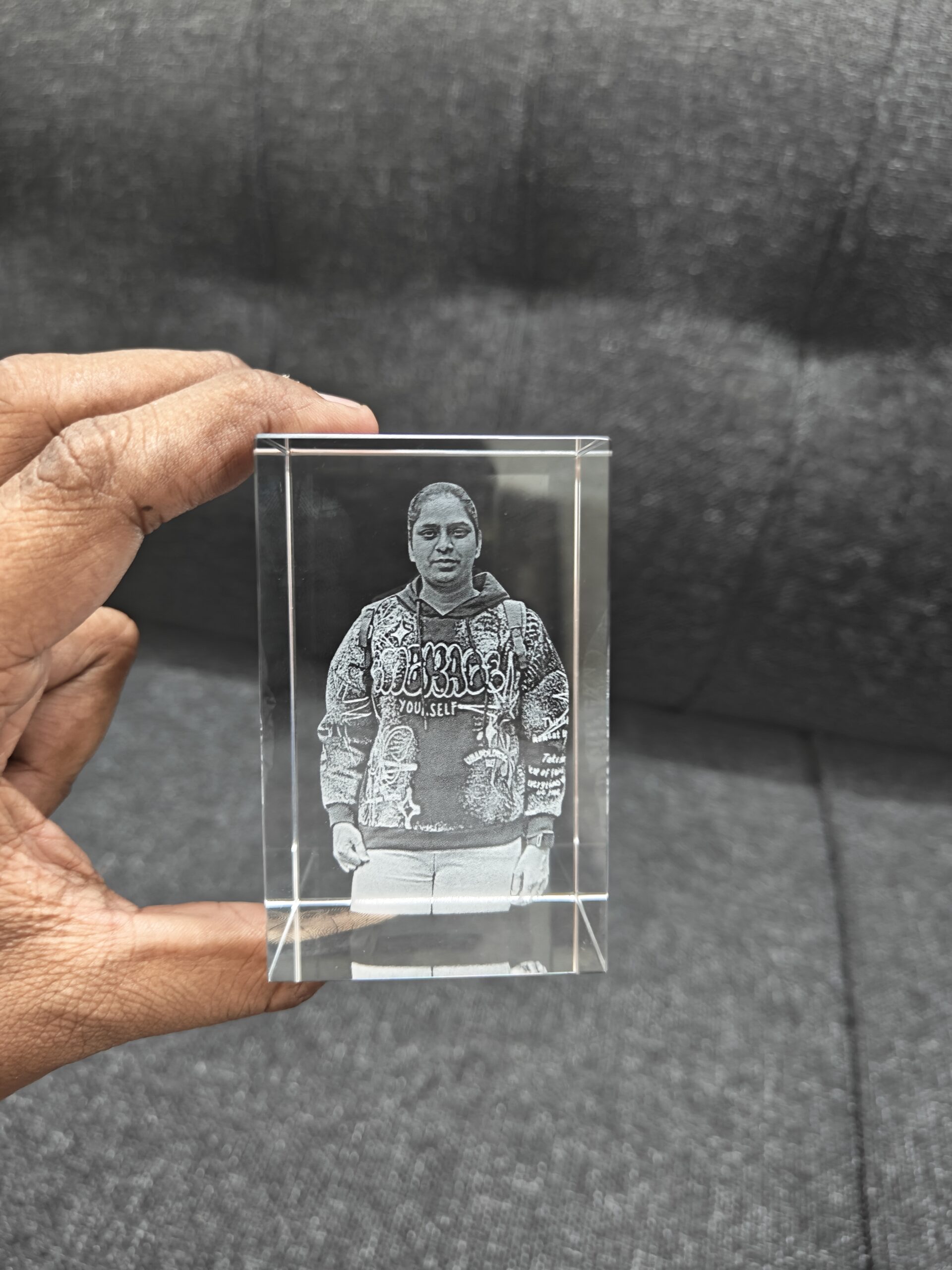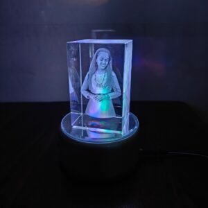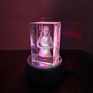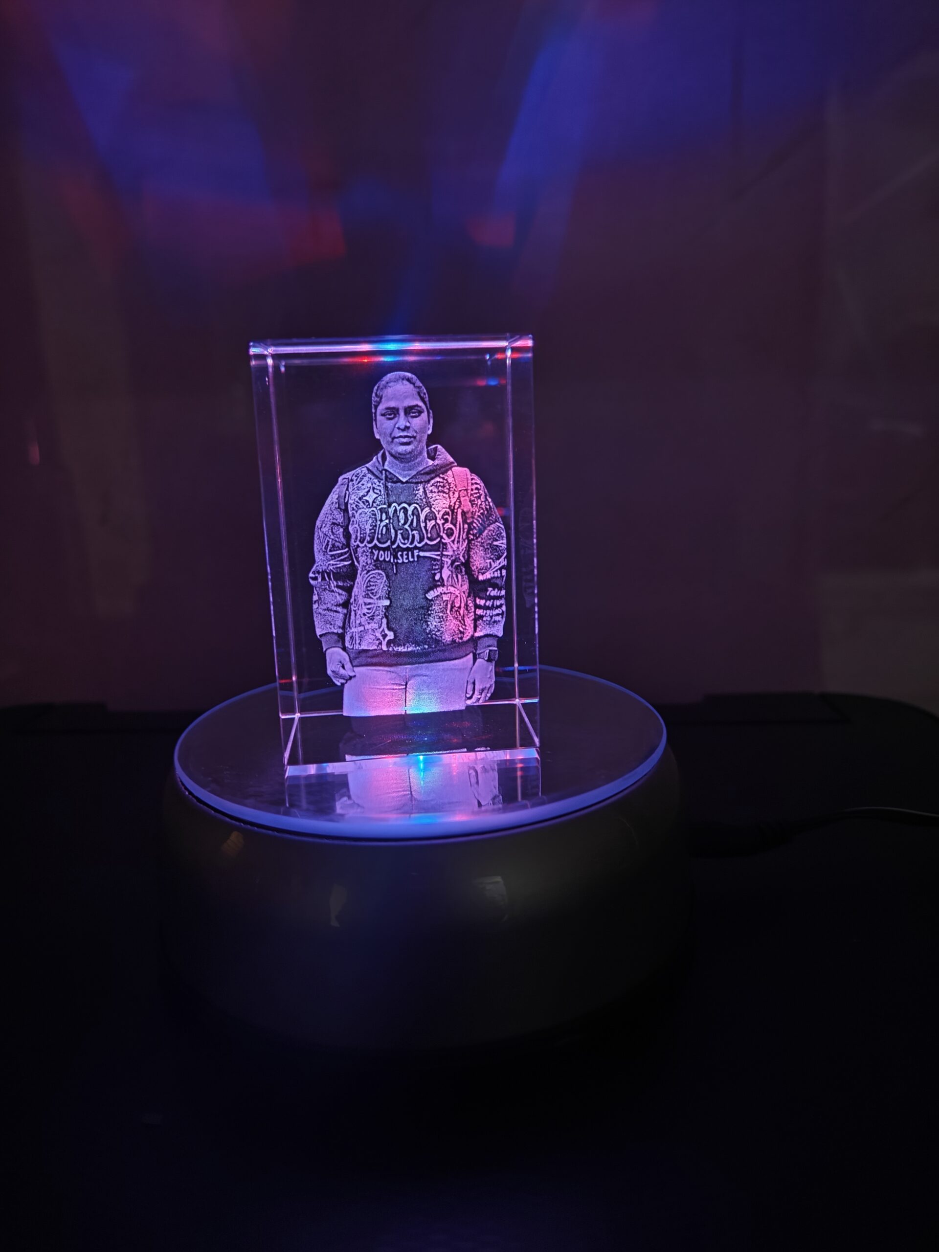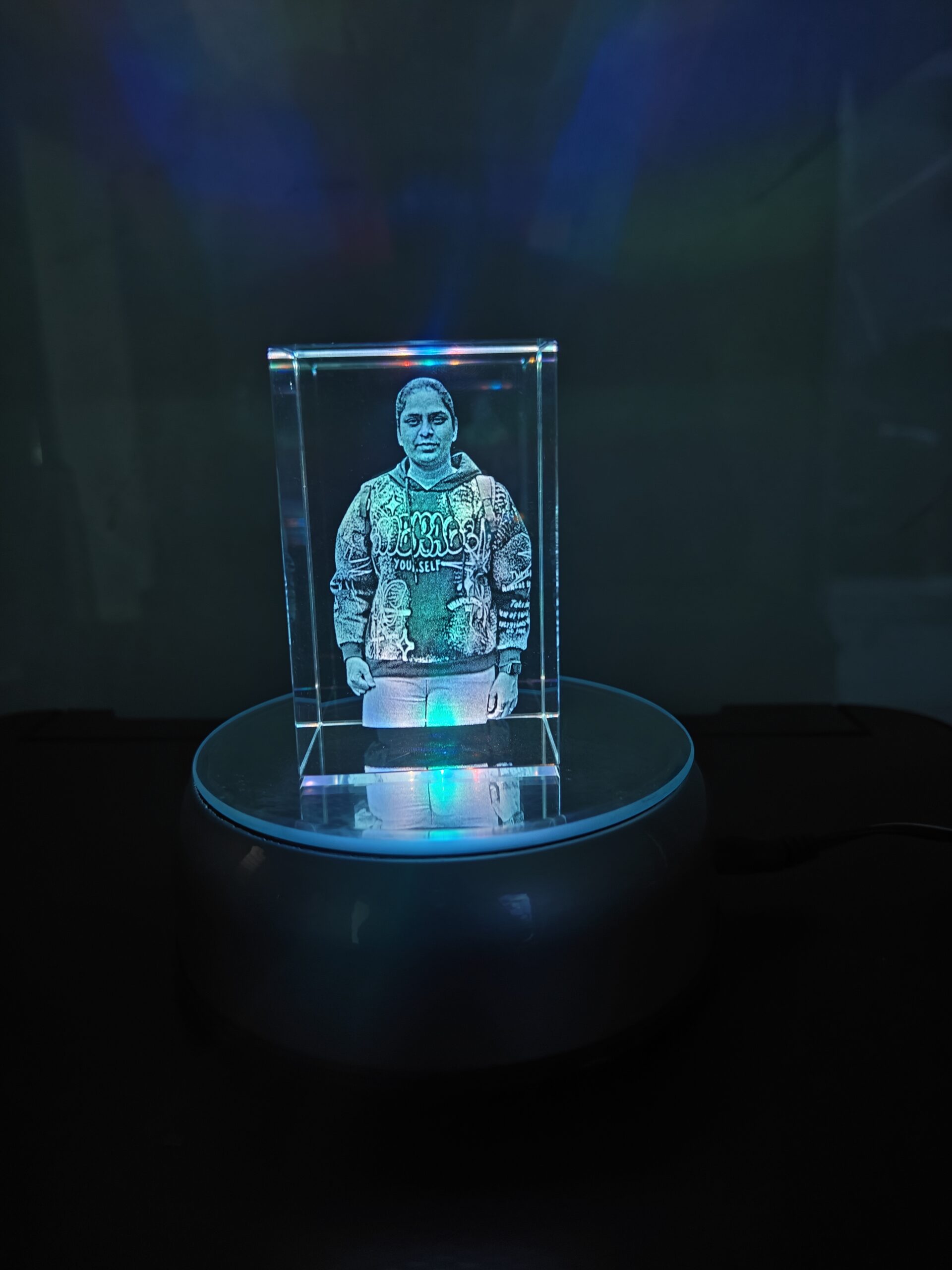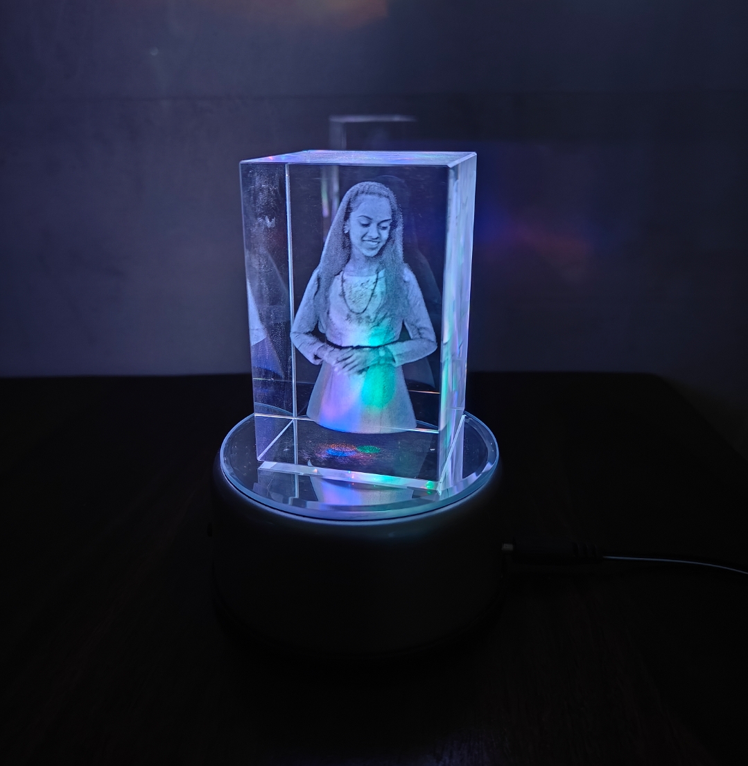 A beautifully crafted photo crystal that brings your memories to life with a smooth, multi-color rotating LED base. The vibrant light and elegant crystal design make it a perfect gift for any occasion.
