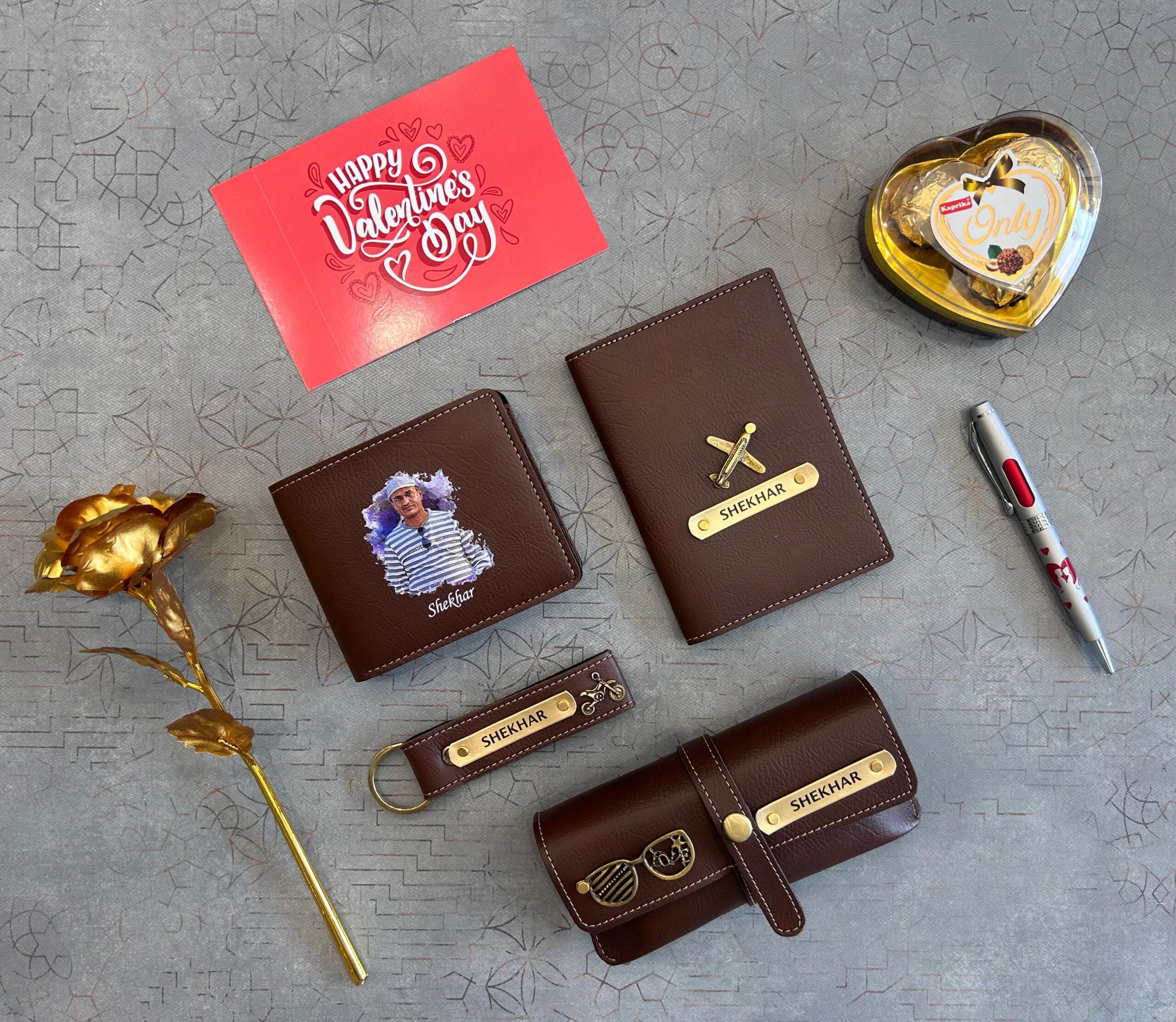 ♦️Scope of photo customised on Wallet with name , and name customised on pen , keychain , passport cover and eye wear case with 1 name tag and 1 charm